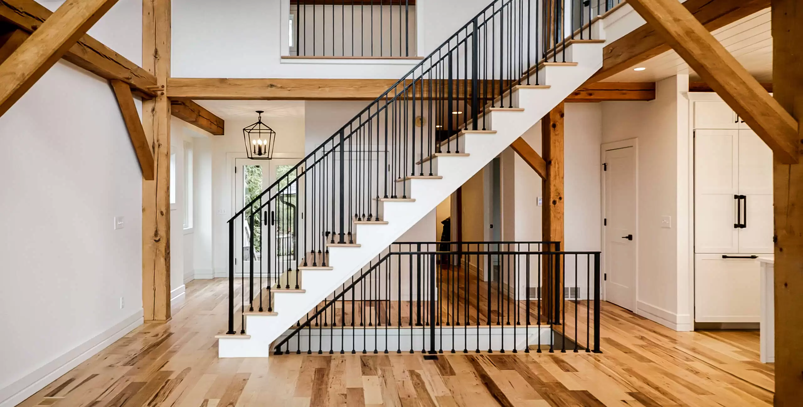 Inside, functionality and flow were at the forefront. The kitchen’s existing island didn’t serve the family well, so we redesigned the space with improved storage, a more efficient layout, quartz countertops, and custom cabinetry tailored to how the clients use the home. The stairway also received a full refresh with new handcrafted railings fabricated locally, bringing a modern architectural detail to a previously dated feature.