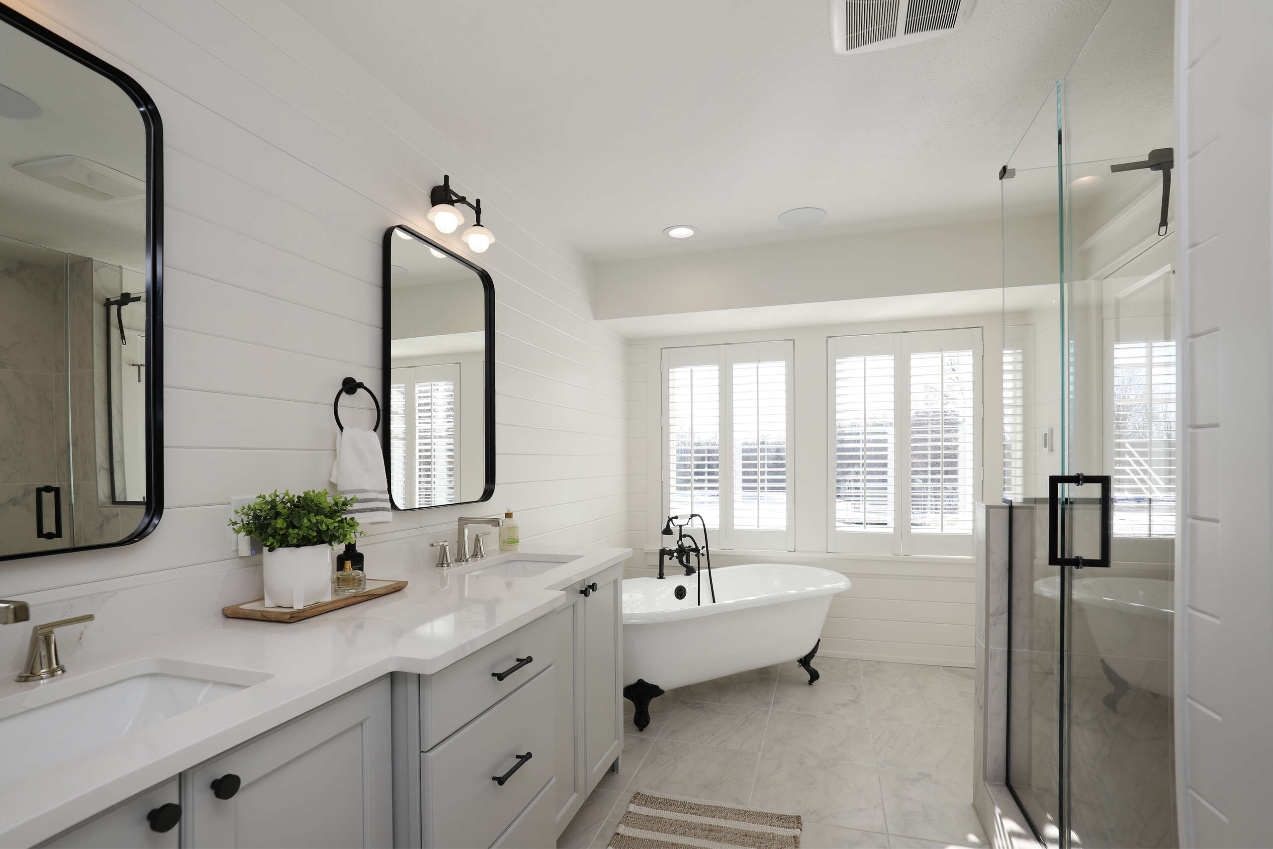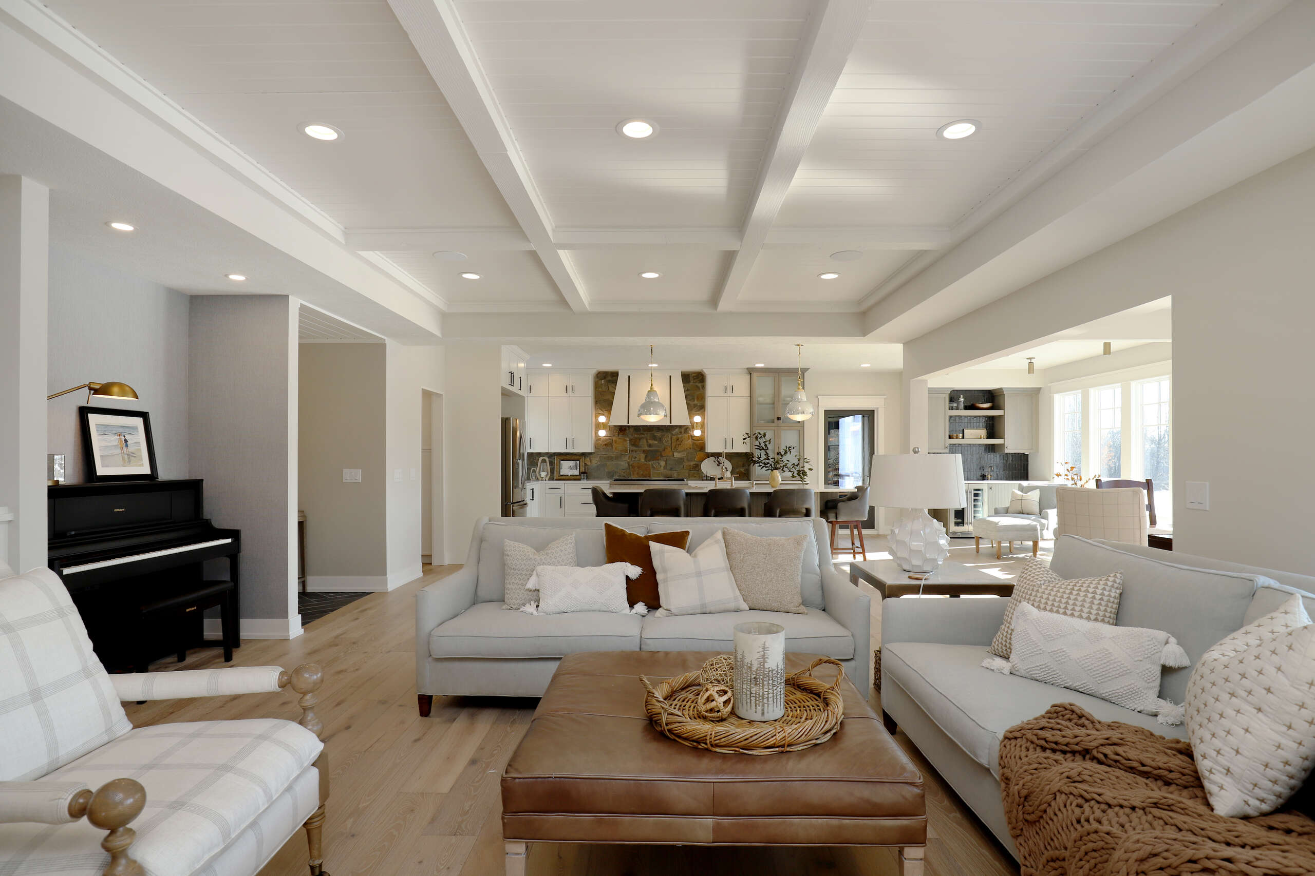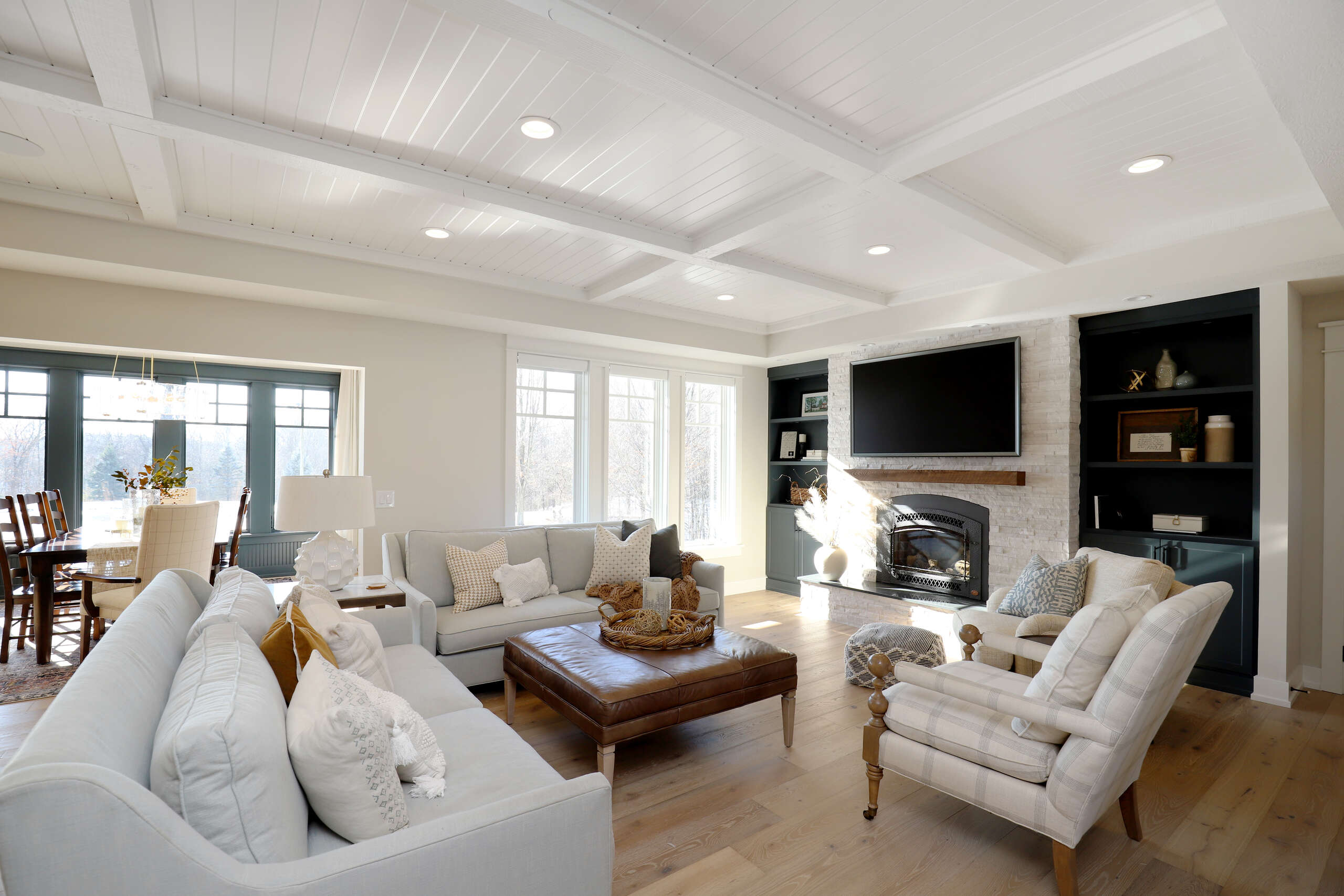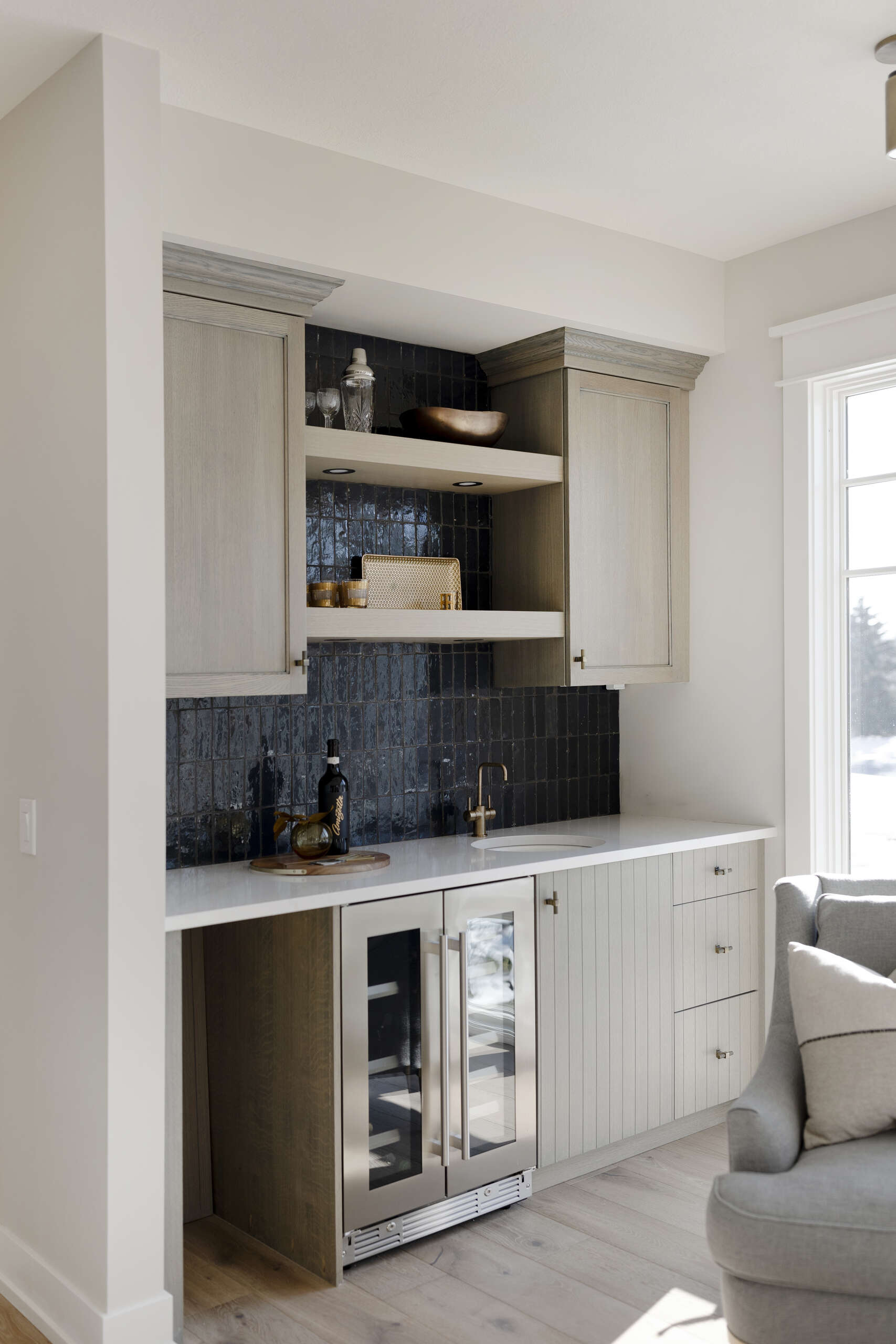 For this most recent transformation, their growing family was running out of space. Together, we reimagined the home to feel open, bright, and functional for everyday living. Natural light and outdoor views were top priorities, so we added a full wall of windows along the back of the house and raised portions of the ceiling to nine feet, creating an airy sense of volume.